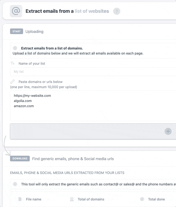 Upload a file with a list of companies or domains and we will extract all generic emails support, contact, sales and more from a list of domains, plus phone numbers and social media (Facebook, Twitter etc)